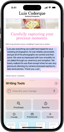 Built into your iPhone, iPad, Mac, and Apple Vision Pro* to help you write, express yourself, and get things done effortlessly.** Designed with groundbreaking privacy at every step.