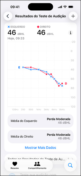 Resultados imediatos. Auxílio imediato. Ao concluir o teste, você obtém um perfil personalizado com resultados fáceis de entender e informações sobre sua audição. Se você tiver pouca ou nenhuma perda auditiva, mas ainda assim se beneficiaria de ouvir algumas frequências com mais clareza, pode configurar o Assistente de Mídia e ajustar o áudio em conteúdos e chamadas. E, se você percebeu perda auditiva leve a moderada, poderá configurar o recurso de Aparelho Auditivo.