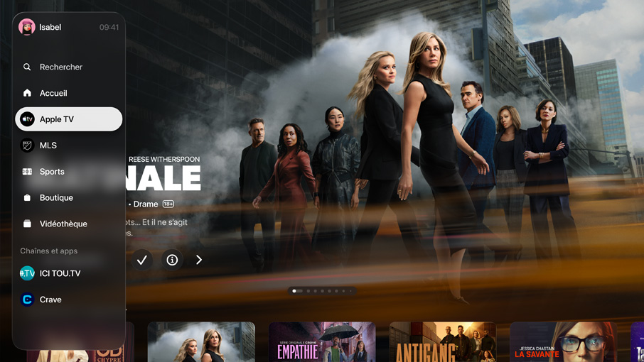 App Apple TV. Achetez, louez et regardez vos films et séries dans une seule et même app remplie de suggestions judicieuses. Appréciez des centaines de séries et de films originaux dans toute leur splendeur sur Apple TV. Et abonnez-vous uniquement aux chaînes qui vous intéressent. Vous pouvez en faire profiter jusqu’à cinq membres de votre famille – sans apps, comptes ou mots de passe supplémentaires.