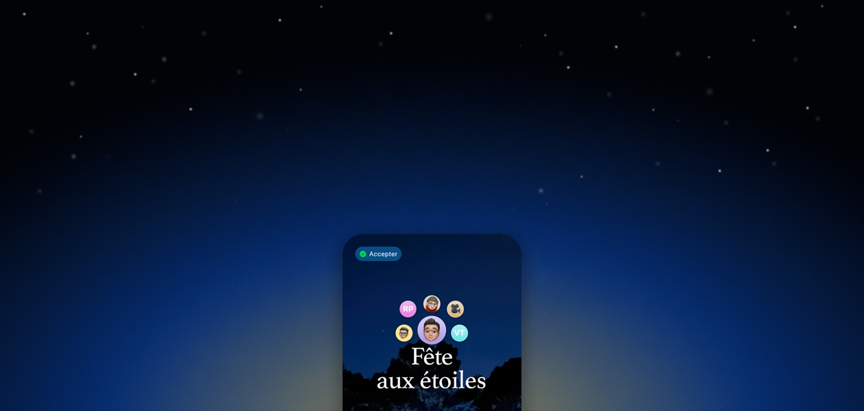 Apple Invitations est une nouvelle fonctionnalité iCloud+ qui vous aide à souligner n’importe quelle occasion. Personnalisez votre faire-part avec le contenu de votre photothèque ou un visuel original créé dans Image Playground4. Ajoutez un itinéraire et partagez musique ou photos pour donner vie à votre événement. Puis envoyez le tout à vos convives pour leur permettre de confirmer leur présence.
