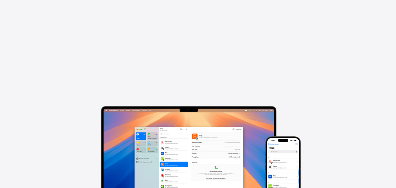 Elle simplifie la gestion des données d’authentification sur tous les appareils dotés d’iCloud et vous avise si elle détecte des mots de passe faciles à deviner. Vous pouvez créer, enregistrer et personnaliser des mots de passe robustes, les partager avec qui vous voulez, et plus encore.