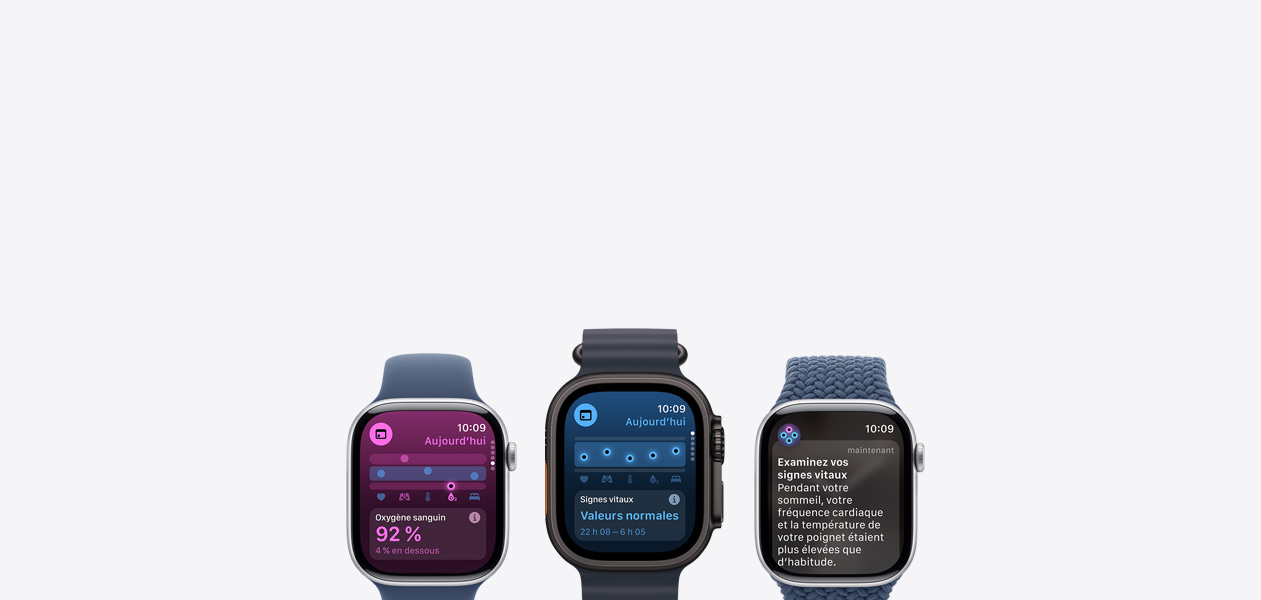 Veillez sur votre état de santé quotidien à même votre poignet. Portez votre Apple Watch en dormant pour suivre des signes vitaux nocturnes comme la fréquence cardiaque moyenne, la fréquence respiratoire, l’oxygène sanguin et la température au poignet. Et recevez des notifications lorsqu’une mesure s’écarte de vos tendances.