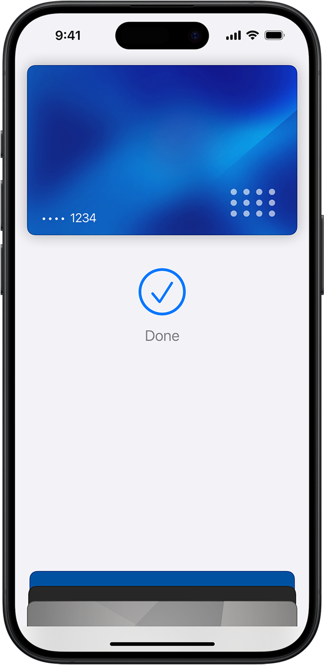 Es ist ganz leicht. Füge einfach eine Kredit‑, Debit- oder Prepaidkarte in der Wallet App auf deinem iPhone hinzu. Und denk daran, deine Karten auch auf anderen Apple Geräten hinzuzufügen, mit denen du Apple Pay verwenden möchtest. Das funktioniert auf iPhone, Apple Watch, Mac und iPad. Bei einem Upgrade auf ein neues iPhone kannst du deine Karten in einem einfachen Schritt automatisch auf das neue Gerät übertragen.