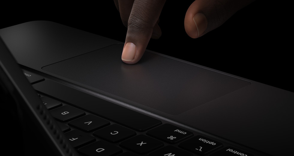 Le Magic Keyboard, avec son design portable et élégant et son repose‑poignet en alu­minium12, offre un exceptionnel confort de frappe et d’utilisa­tion du trackpad. Le clavier inclut une rangée de touches de fonction et un grand trackpad en verre avec retour haptique pour un travail précis et les gestes Multi‑Touch.