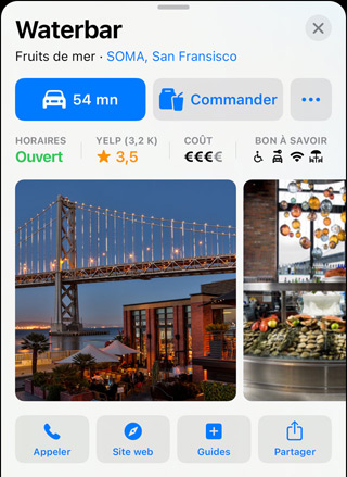 Choisissez une destination, et sa fiche interactive vous montre tout ce dont vous avez besoin d’un simple coup d’œil. Consultez des renseignements comme l’adresse, les horaires d’ouverture, le site web et le numéro de téléphone, mais aussi des informations sur la gamme de prix, des galeries de photos, les guides de ville associés et les types de paiements acceptés. Vous pouvez même vérifier si votre chien est le bienvenu. Lancez Flyover pour vous faire une idée du lieu et des alentours. Vous pouvez également louer un vélo, payer un parcmètre ou encore commander à manger d’un simple geste. C’est rapide, et parfaitement sécurisé.