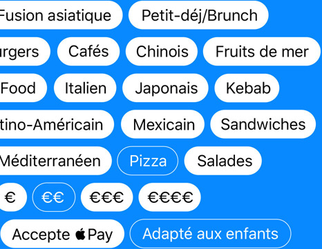 C’est si simple et rapide de trouver ce que vous cherchez dans Plans. Vous pouvez utiliser des filtres ultra-ciblés pour trouver des restaurants selon leur type de cuisine ou leur gamme de prix, ou pour connaître les lieux proposant de la vente à emporter. Vous pouvez aussi choisir de ne voir que les établissements ouverts au moment précis où vous consultez l’app. Vous souhaitez élargir votre recherche ? Il vous suffit de vous déplacer sur la carte, et les résultats s’actualisent automatiquement. Vous ne voulez pas aller loin ? Touchez À proximité pour trouver les adresses proches dans des catégories telles que Restaurants, Stations-service, Cafés, Hôtels, Bars, Restauration rapide, Épiceries et Centres commerciaux. Ces lieux apparaissent sur le plan sous la forme de pastilles de couleur afin que vous puissiez faire votre choix encore plus facilement.