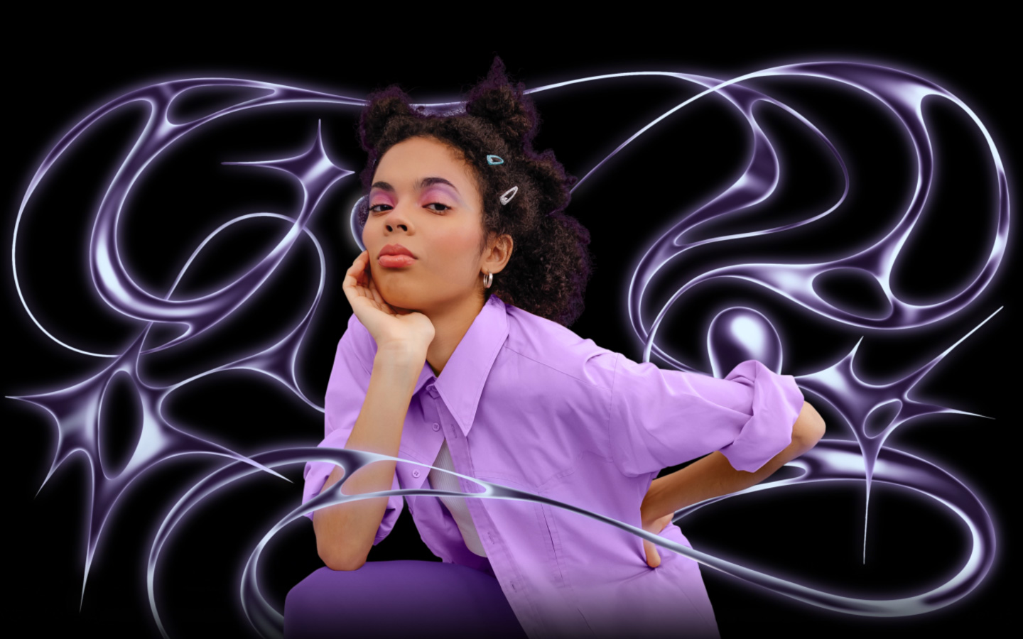 Image of person with braids and wearing a purple sweater with stylized abstract background, moves into MacBook Pro 16 and iPad Pro 13 devices, screens show the Pixelmator Pro workspace with layers panel on the side, image editing