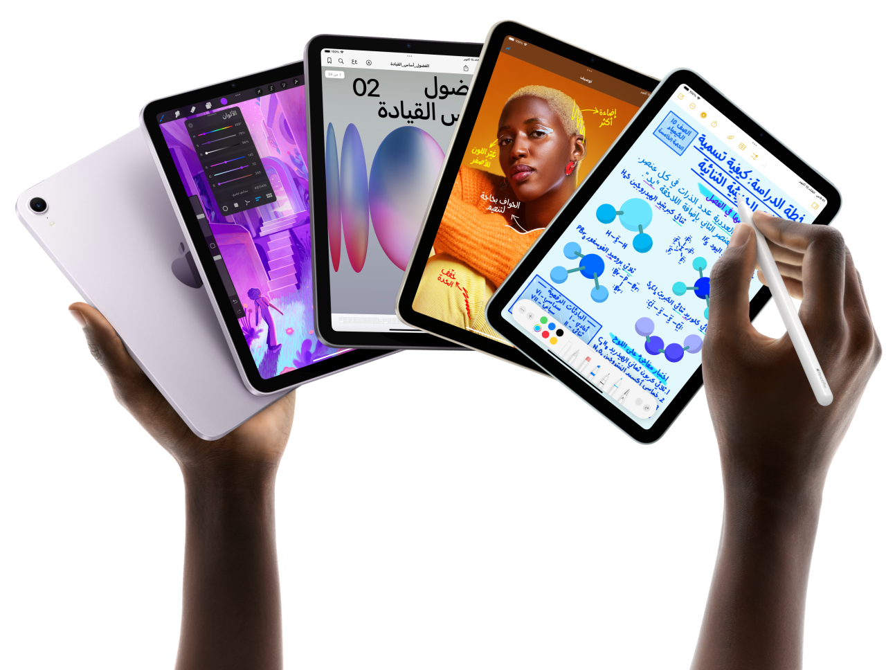 موديلات iPad mini متعددة في الوضعين الأفقي والرأسي تعرض تطبيقات بما في ذلك Markup، والحاسبة، والكتب، وLogic Pro for iPad، وForeFlight، والملاحظات، وZinnia، وProcreate، وAdobe Lightroom، وInfinity Nikki.موديلات iPad mini متعددة في الوضعين الأفقي والرأسي تعرض تطبيقات بما في ذلك الحاسبة، والكتب، وForeFlight، وProcreate، وAdobe Lightroom.