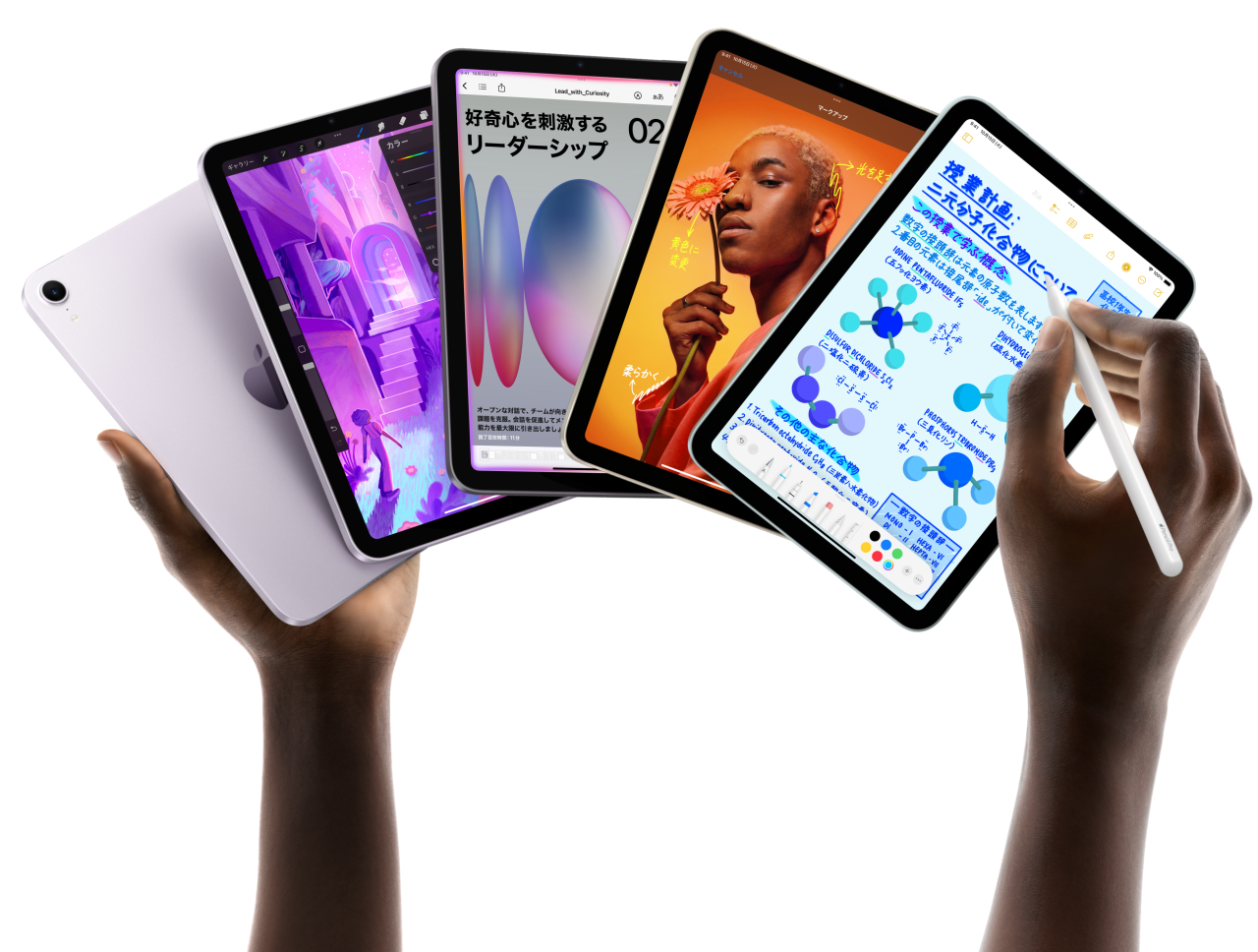 Apple Pencilは、絵を描いたり、色を塗ったり、手書きで入力したり、メモを取る時の使い心地に基準を打ち立てました。それは直感的で、精密で、魔法のようです2。ピクセルレベルの精度と低いレイテンシー。傾きを感知するセンサー。パームリジェクションテクノロジー。どのモデルを選んでも、そのすべてを体感できます。さらに、より多くの機能が追加されたApple Pencil Proなら、これまで以上の方法であなたのアイデアを形にできます。