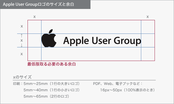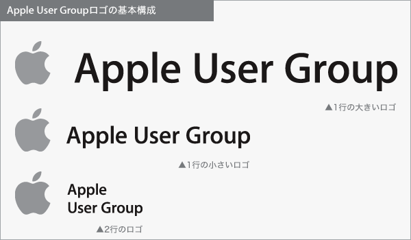 Apple User Groupロゴおよび商標使用に関するガイドライン 2003年5月 概要 本内容は「APPLE USER GROUPS SIGNATURE and TRADEMARK LICENSE」に附属する「Apple User Groups Signature and Trademark Guidelines」に置き換わるものです。基本的な方針内容に変更はありませんが、ロゴの改訂に伴いより細かく事例を取り上げているものです。 いずれのロゴについても、使用にあたってはApple Inc.と事前に書面によるライセンス契約を締結する必要があります。ライセンス契約が締結されているか忘れてしまったグループは、[email protected]までお問い合わせください。 Apple User Groupロゴの要素はユーザグループの名称や社名を初めとするビジネスアイデンティティの中に組み込むことはできません。また、こうしたビジネスアイデンティティの代りにApple User Groupロゴを利用することはできません。 Apple User Groupロゴは、必ず電子的な方法でAppleから提供されたアートワーク(EPSファイル)から完全に複製してください。Apple User Groupロゴは、部分的にであっても変更することは認められていません。(これについて詳しくは後述します) ロゴの構成と配色