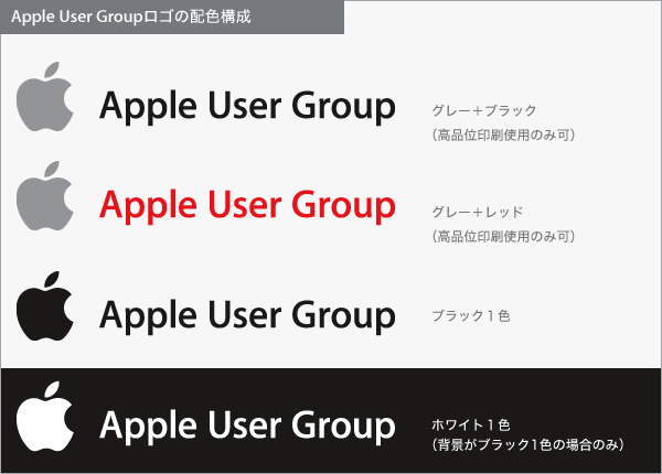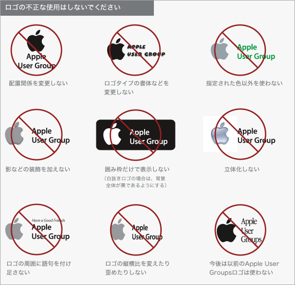 誤用を避けるために Apple User Groupロゴの模倣物を作成したり、三次元的な描画を行うような方法でロゴを複製してはいけません。Webや電子ブックなどでアニメーション表示したり、回転させたり、ゆがめたりすることも禁止されています。Apple User Groupロゴまたはその一部を修飾要素や背景、背景などのパターンなどに使用することもできません。 変更で唯一認められている操作は、ロゴ全体を前節で紹介した範囲で拡大縮小することのみです。 かつて利用されていたApple User Groupsロゴは、今後の印刷物や電子出版物には利用しないでください。変更が可能なものについては、できる限り新しいロゴへ差し替えるようにしてください。