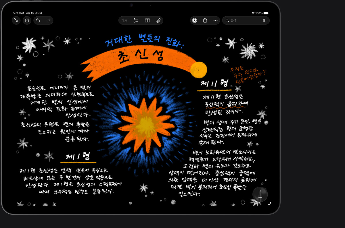 Apple Pencil은 그림을 그리고, 손글씨를 쓰고, 필기를 하는 행위가 어떤 느낌으로 이루어져야 하는지에 대한 기준을 제시합니다. 직관적이고, 정밀하면서도 사뭇 신기롭죠. 픽셀 단위의 정밀함에 극히 짧은 지연 시간, 기울기 감지 기능, 팜리젝션 기능까지 갖췄답니다. Apple Pencil Pro는 여기에 더욱더 많은 기능을 더해 전에 없던 방식으로 당신의 아이디어에 생명을 불어넣을 수 있게 해줍니다.2
