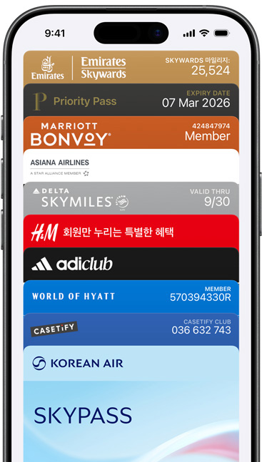애용하는 카페, 숙박업체, 항공사 등의 포인트 카드를 ‘지갑’에 추가할 수 있습니다. 덕분에 이제 번거롭게 실물 카드를 들고 다니지 않아도 되고, 마일리지 적립이나 무료 카페라테 등의 혜택을 놓칠 일도 없죠. 포인트 적립부터 사용까지 한 곳에서 가능한 최고의 방법이랍니다.
