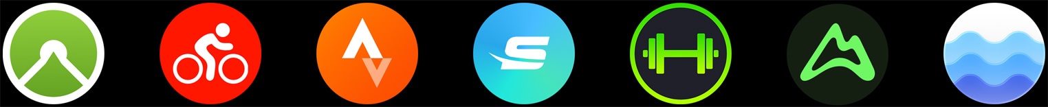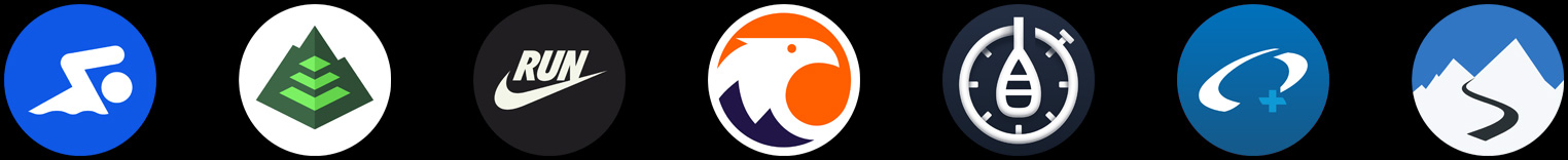 التطبيقات المعروضة: Komoot وMapMyRide وStrava وSwim.com وSmartGym وAllTrails وتطبيق المد والجزر وMySwimPro وGaia GPS وNike Run Club وPalisades وPaddle Logger و+Oceanic وتمرين التزلج على الجليد.