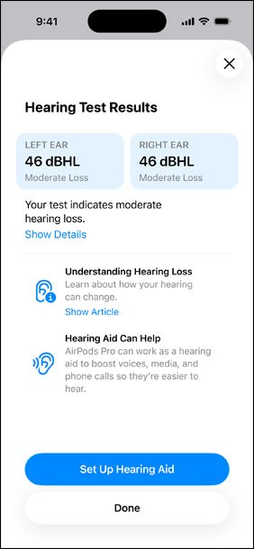 Rezultāti bez gaidīšanas. Atbalsts bez kavēšanās. Kad pabeigsi testu, redzēsi personalizētu profilu ar saprotamiem rezultātiem un ieskatu tavas dzirdes veselībā. Ja tev ir neliels dzirdes zudums vai tava dzirde ir laba, bet tomēr vēlies dzirdēt dažas frekvences skaidrāk, varēsi pielāgot mediju un zvanu audio Media Assist iestatījumos. Ja tev ir viegls vai vidējs dzirdes zudums, tev piedāvās uzstādīt dzirdes aparāta funkciju.