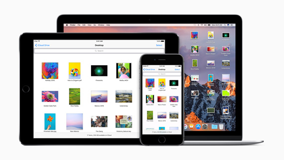 With macOS Sierra you can automatically have all the files on your Desktop and in your Documents folder on any Mac, iOS device or even PC. You simply save your files on your Desktop or within your Documents folder as you usually do and you will have them everywhere you need them. You can access your files on your iPhone and iPad in the iCloud Drive app and on iCloud.com or the iCloud for Windows app. And when you log into a second Mac, your files are automatically on the Desktop and in the Documents folder, exactly where you saved them.