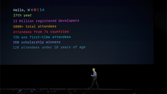 PHOTOS June 13, 2016 Hello from WWDC16 Photo Highlights from Day One of the 2016 Worldwide Developers Conference The crowd in front of Bill Graham Civic Auditorium. Tim Cook kicks off the keynote presentation. Bozoma Saint John demonstrates updates to Apple Music. Kevin Lynch announces watchOS 3 preview. Kevin Lynch demos watchOS 3 features. Jay Blahnik introduces apps for Apple Watch. Jay Blahnik previews fitness apps for watchOS 3. Craig Federighi introduces macOS Sierra. Eddy Cue demos new Apple TV capabilities. Eddy Cue previews new tvOS features. Cheryl Thomas demos Swift Playgrounds. Bethany Bongiorno & Imran Chaudhri demo Messages features. Stacey Lysik demonstrates watchOS 3 features. Craig Federighi previews iOS 10. Tim Cook surrounded by student developers at WWDC16. Press Contacts Apple Media Helpline [email protected] Apple Media Helpline [email protected]