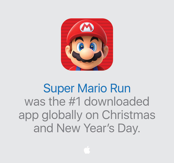 Customers broke all-time records this holiday season with purchases from the App Store topping $3 billion in December. In the same month, Nintendo’s Super Mario Run made history with more than 40 million downloads in just four days after its release, and was the most downloaded app globally on Christmas and New Year’s Day.