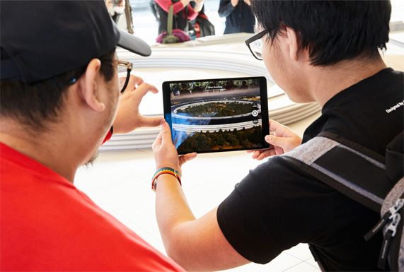 Inviting guests to explore Apple Park in an immersive and engaging way, a 3-D model of the campus is brought to life by augmented reality technology. Visitors can learn about the world’s largest naturally ventilated building and view one of the largest on-site solar energy installations in the world. Visitors can also choose to lift the entire roof off the building to peek inside to the collaborative office pod layout.