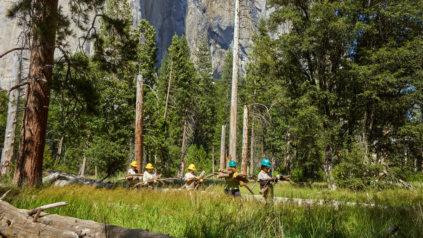 The National Park Foundation, an Apple partner, funds Yosemite Ancestral Stewards and Ancestral Lands Conservation Corps work to restore a sacred black oak grove in El Capitan Meadow