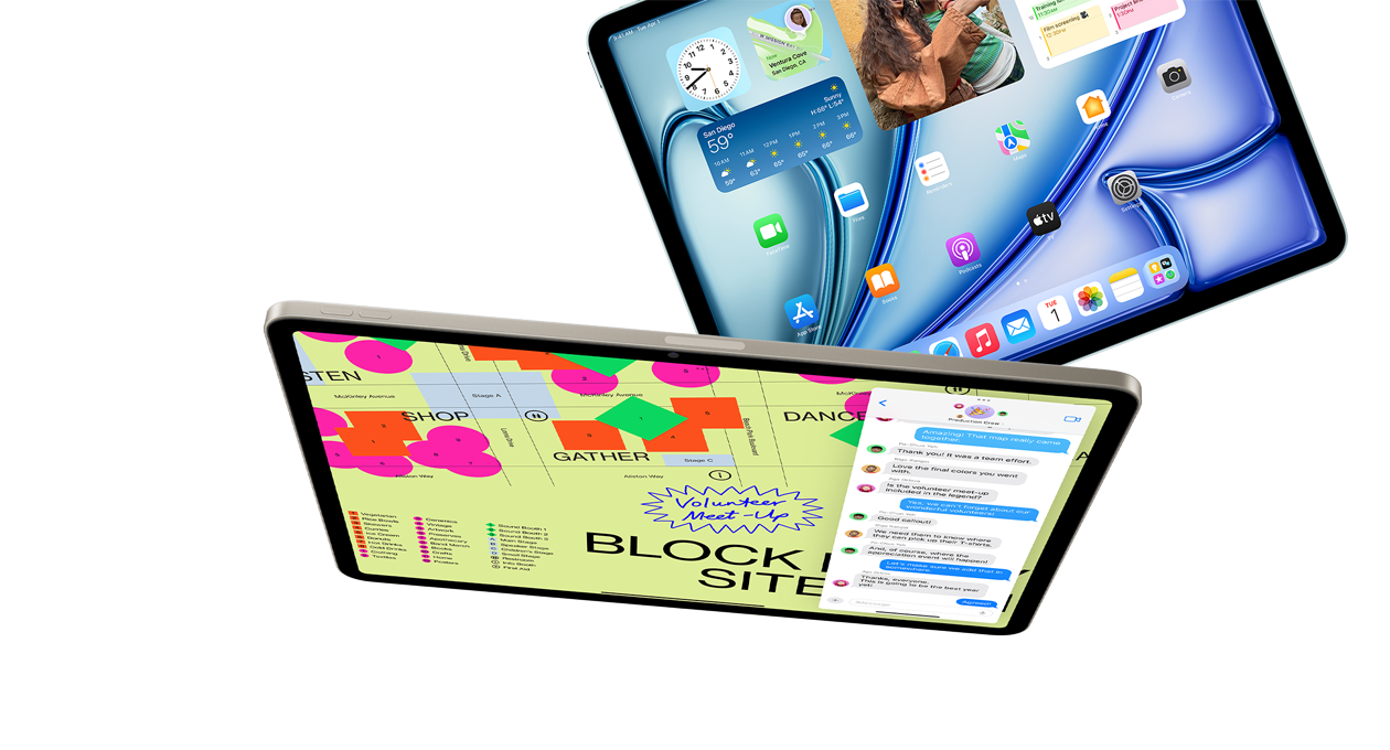 De voorkant van een iPad Air. De gebruiker belt via FaceTime en bekijkt Keynote. Daarachter is de achterkant van een andere iPad Air te zien.