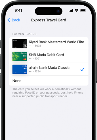 In Saudi Arabia, Express Mode is currently only available for use for transport via bus or metro in Riyadh. View complete list of cities where Apple Wallet: Public Transport is available here.