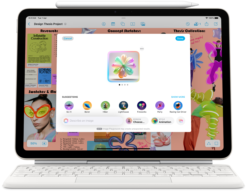 Apple Intelligence enables delightful ways to express yourself visually. Turn a rough sketch into a related image with Image Wand. And create new images based on descriptions, suggested concepts and even a person from your Photos library with Image Playground.
