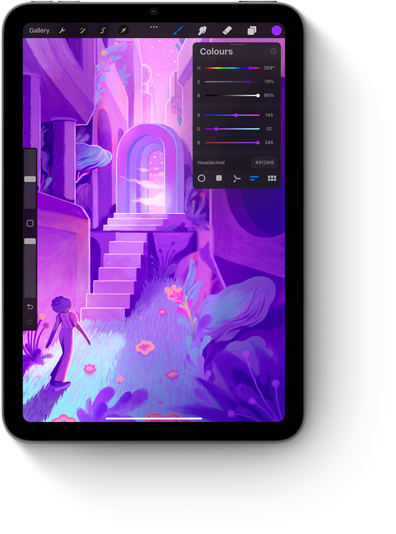 iPad mini shown in portrait view displaying a colourful Pixelmator screen.