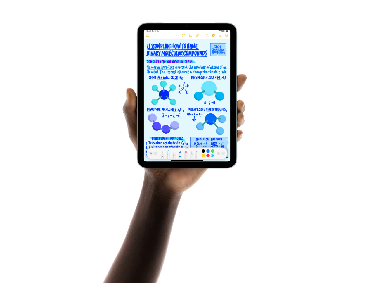 iPad mini in portrait view with a user’s hand using Apple Pencil Pro with Maths Notes.