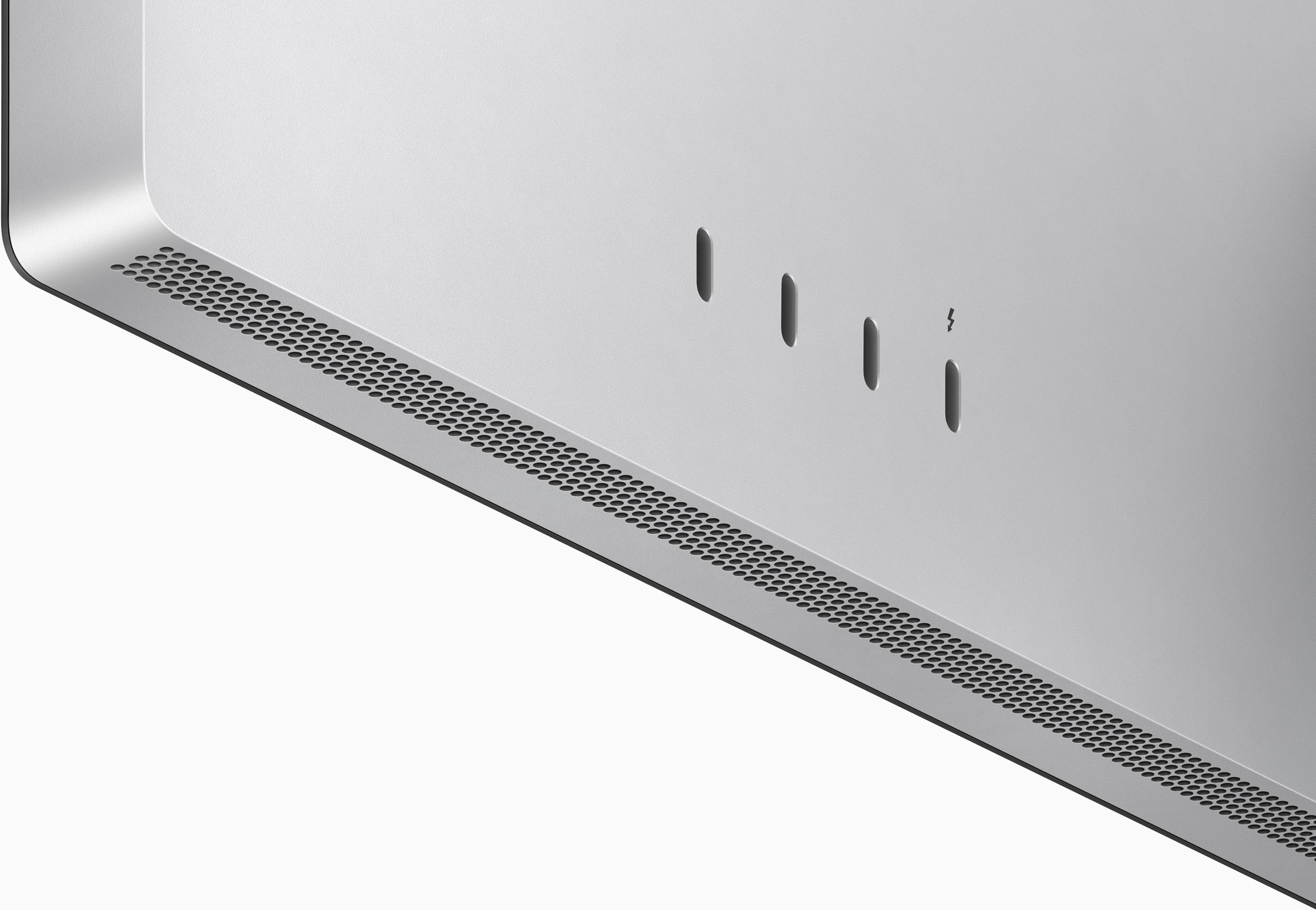 Three USB-C ports let you connect, power, and charge devices — from networking and external drives to your keyboard, mouse, or iPhone. The Thunderbolt port connects Studio Display to your Mac with a single cable. That same port can charge compatible Mac notebooks — and even fast‑charge a 14‑inch MacBook Pro.