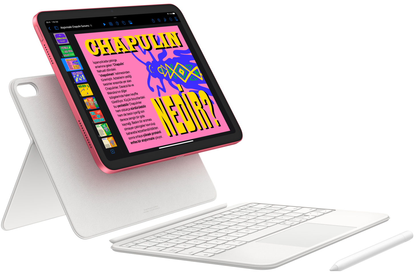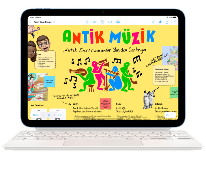 Apple Pencil ile not alın, çizim ve resim yapın. Magic Keyboard Folio’nun çok yönlü iki parçalı tasarımıyla rahatça yazın, trackpad’i kullanın ve sevdiğiniz içeriklerin keyfini çıkarın.2 İster tanıdık klavye kestirmelerini isterseniz herhangi bir yerine tıklanabilen trackpad’i kullanın. Ve harika bir yazma deneyimiyle tanışın.