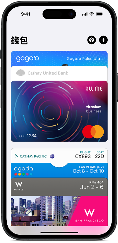 錢包該有的,全都有。 你的信用卡、簽帳金融卡、登機證、票券與酬賓卡,甚至連機車鑰匙等,都能放在「錢包」app 中2。只要以 iPhone 或 Apple Watch 就能使用,因此隨身攜帶的東西更少,能做的卻更多3。