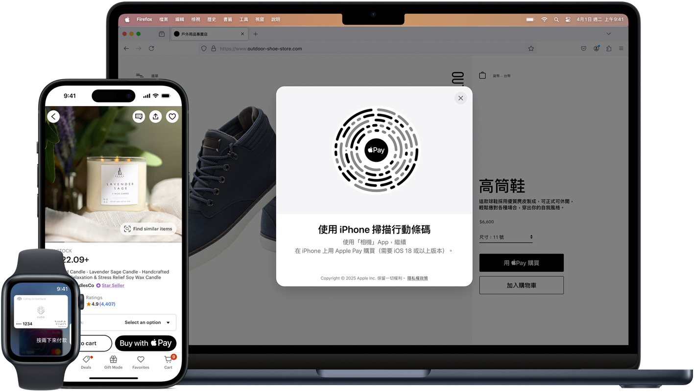 App 內或線上也能用。 你可使用 Apple Pay 在 Safari 和其他瀏覽器中快速支付,無論使用 iPhone、iPad、Mac 或其他電腦,都能省略填寫長長的結帳表單直接付款。在 Apple 裝置上,用按的或點開 Apple Pay 按鈕,再觸一下或看一眼就能付款。在非 Apple 裝置上,可利用你的 iPhone 相機掃描裝置上的 Apple Pay 條碼,並在 iPhone 上完成購買4。你還可以使用 Apple Pay 訂閱 Apple Music 和 Apple TV+ 等服務、在 App Store 上購買 app 與遊戲,以及升級 iCloud 的儲存空間。