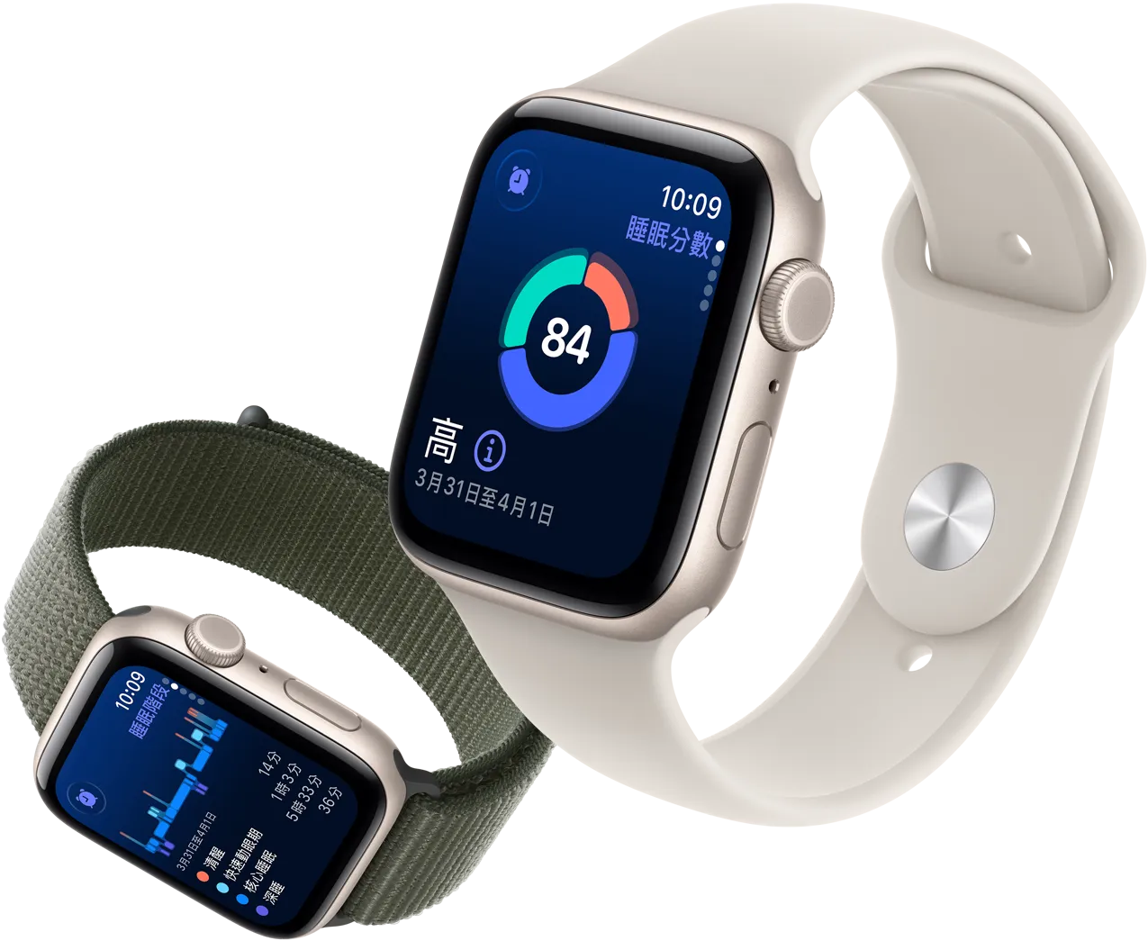 Apple Watch SE 3,採用鋁金屬錶殼,備有星光色與午夜色可供選擇;螢幕顯示生命徵象、心率、睡眠分數、活動記錄圓圈和來電畫面