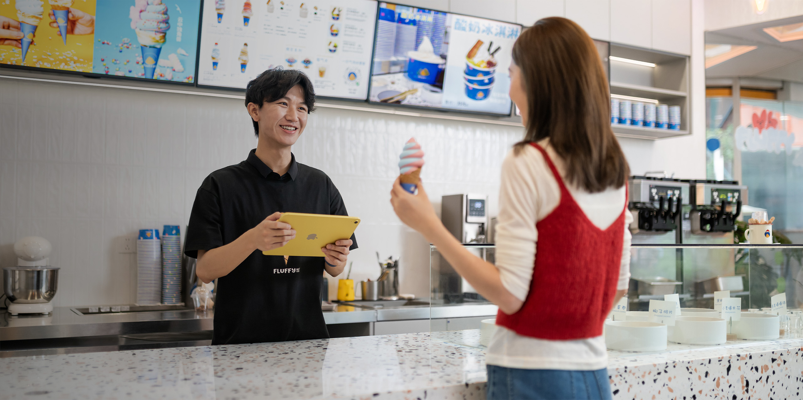 FLUFFY 於 2020 年由三位好友合夥創立。他們的店裡,除了冰淇淋、點心和飲料外,更有各種有趣的品牌周邊商品。因為專注於品牌帶來的樂趣和便利,幫助業務迅速擴展。他們將公司的發展歸功於 Apple 的助力。有了 iPad、iPhone 和 Mac,他們得以在上海各地開設快閃店、還幫助簡化工作流程、全力發揮創造力,並與不斷回流的顧客群建立緊密關係。