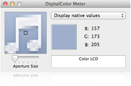 DigitalColor 測量計可顯示螢幕上任何像素的色值。在螢幕上移動指針,DigitalColor 測量計會顯示所選像素的確切色值。你也可將色值轉換成熱門的色彩空間,如 sRGB。