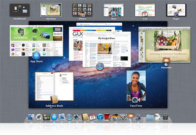 Mission Control 匯集了 Exposé、Spaces、Dashboard 及全螢幕的應用程式,提供系統所有執行程式的鳥瞰檢視畫面。一列縮圖檢視橫跨 Mission Control 的上方,顯示出 Dashboard、桌面空間以及你開啓的全螢幕的應用程式。螢幕的下半部則提供你在桌面上所開啓的視窗的 Exposé 檢視畫面。只要輕鬆在軌跡板上以兩指左右滑動,或是按一下縮圖檢視,即可自 Mission Control 瀏覽你 Mac上執行的所有程式。