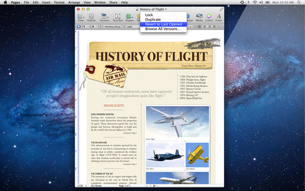 擬份文件,修修改改,無可厚非。OS X Lion 會在你每次開啓文件時、與作業進行間每隔一個小時,自動為文件產生一個新版本,你也可以自行留下文件的快照紀錄。採用與 Time Machine 類似的使用介面,版本功能會在你目前的文件旁邊顯示ㄧ連串的先前版本。