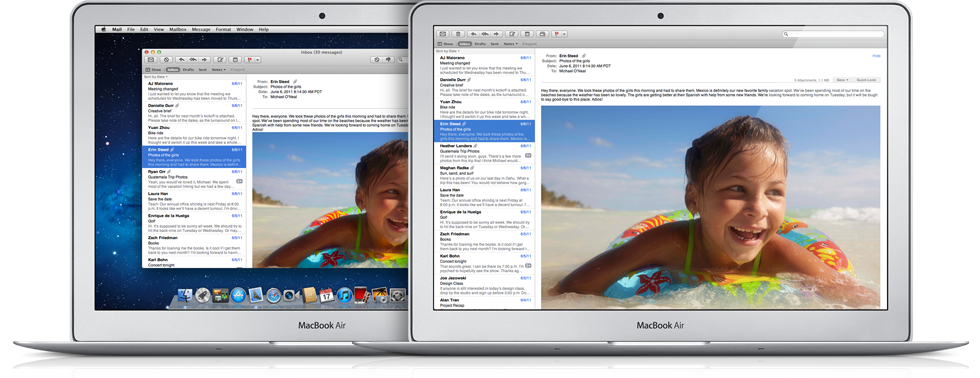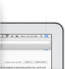 系統層級支援的全螢幕的應用程式,意味著你可以工作更專心也玩樂得更投入,充分善用顯示器每吋空間。從 Mail 到 iPhone 再到 Safari,全螢幕顯示看起來格外壯觀,還有因為全螢幕的應用程式利用到每個可用的像素,這使得在小螢幕上工作也添了一分充實感。