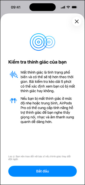 Riêng tư, an toàn và dễ quản lý. Toàn bộ kết quả Kiểm Tra Thính Giác của bạn đều được lưu trữ riêng tư và an toàn trong ứng dụng Sức Khỏe trên thiết bị của bạn. Bạn có thể thực hiện lại bài kiểm tra bất cứ khi nào bạn muốn, theo dõi khả năng nghe của bạn theo thời gian, tải về kết quả kiểm tra và đọc các bài viết hữu ích về sức khỏe thính giác.